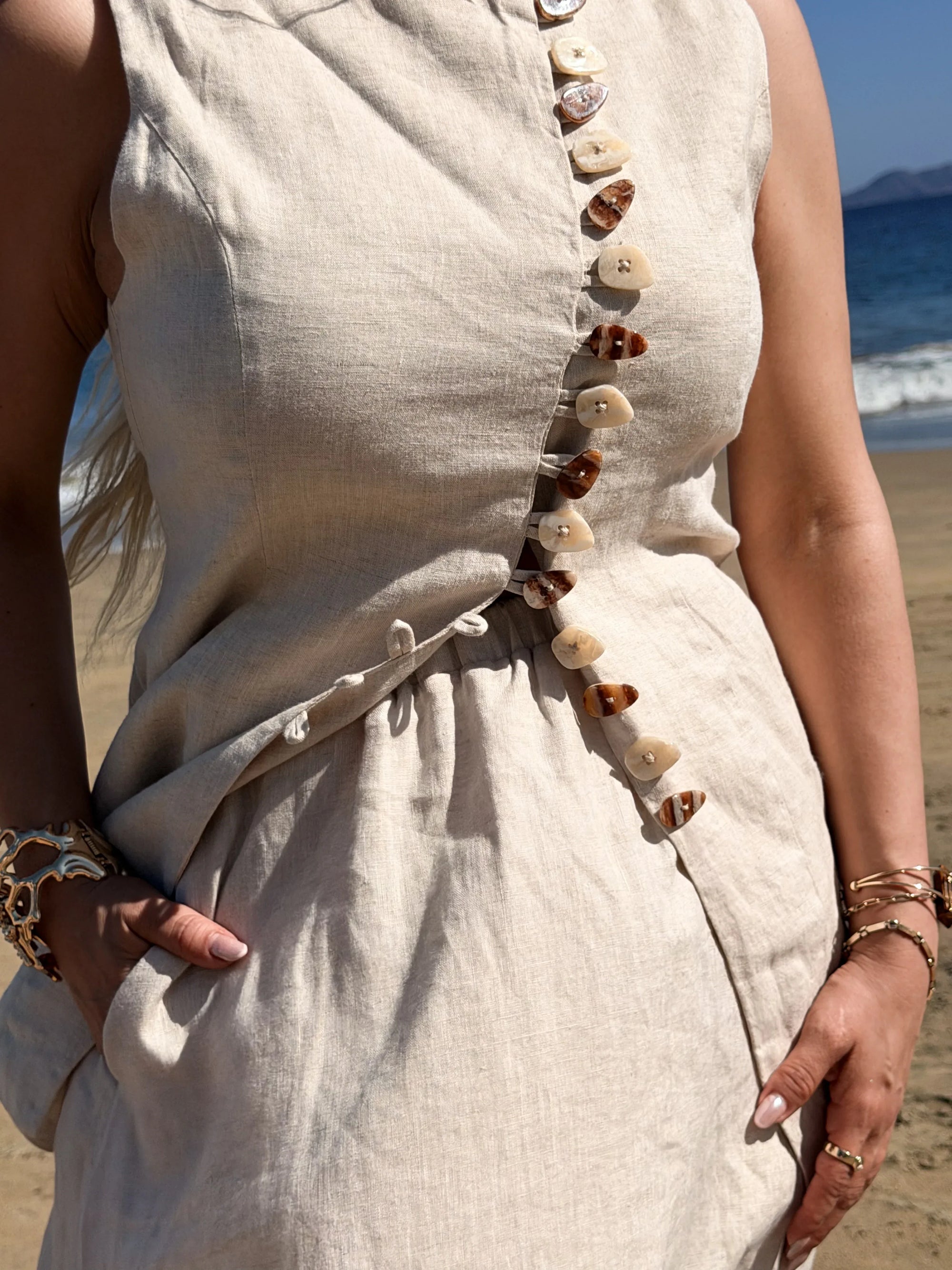 - Botonadura frontal con botones metálicos dorados