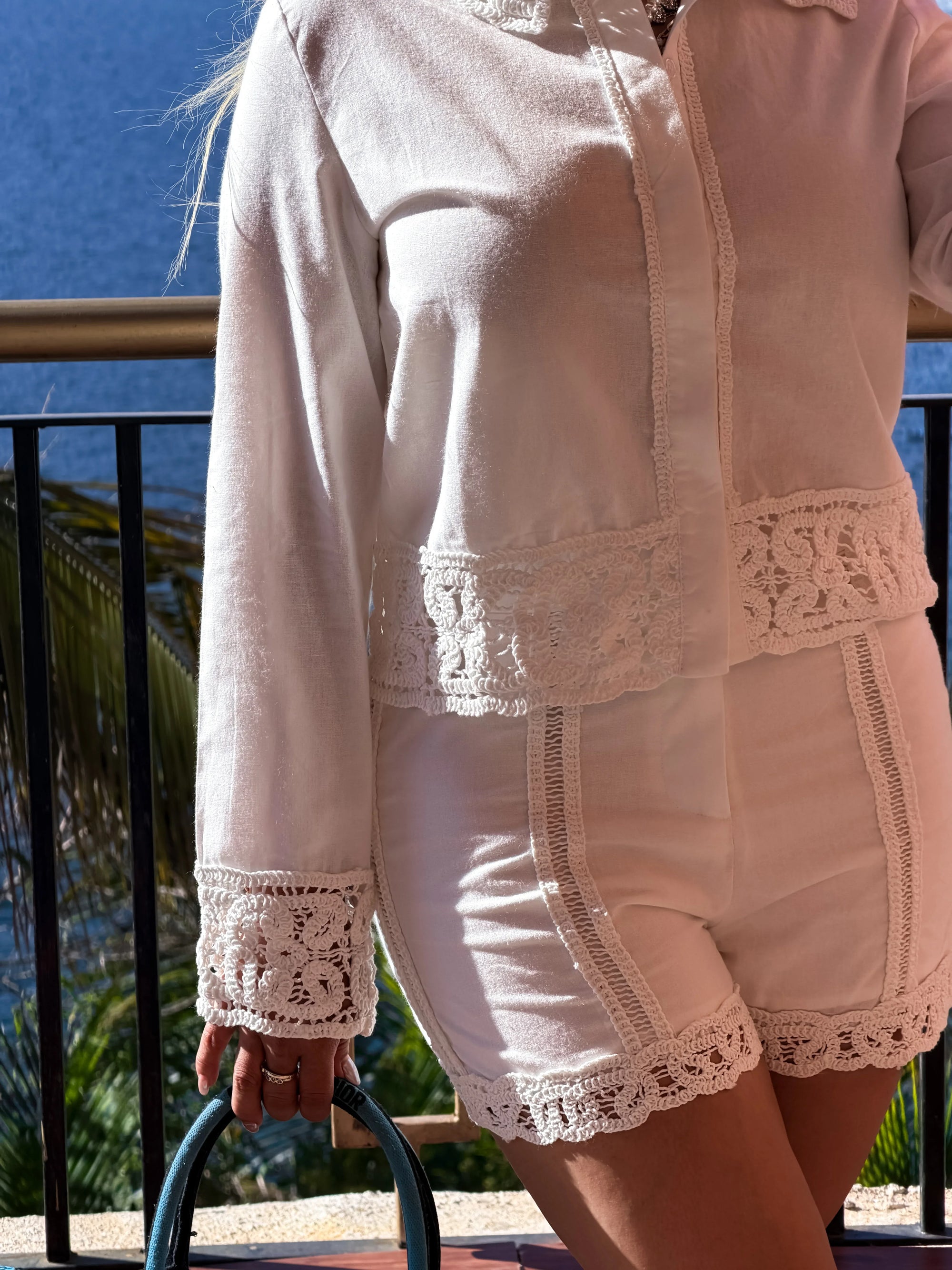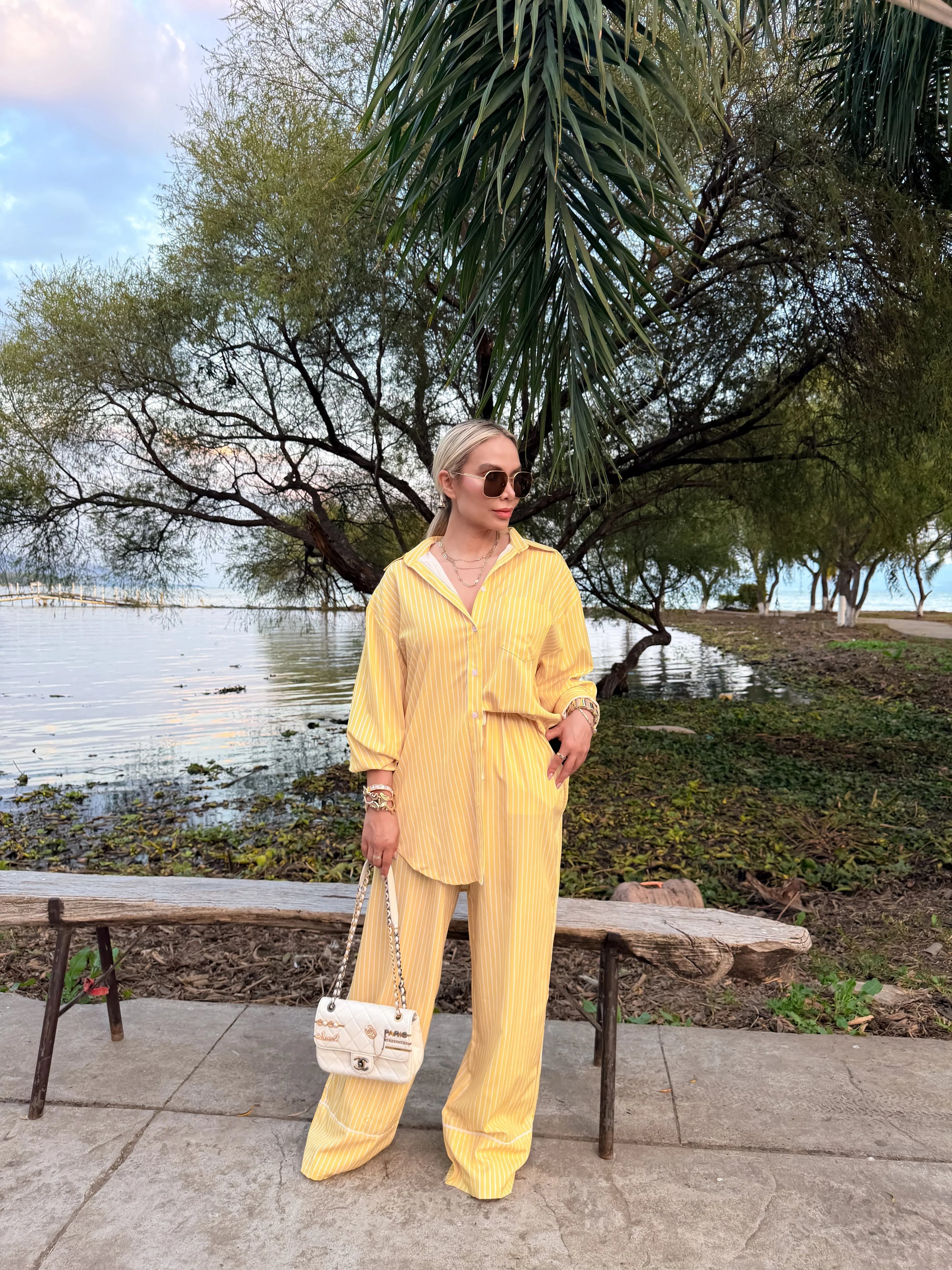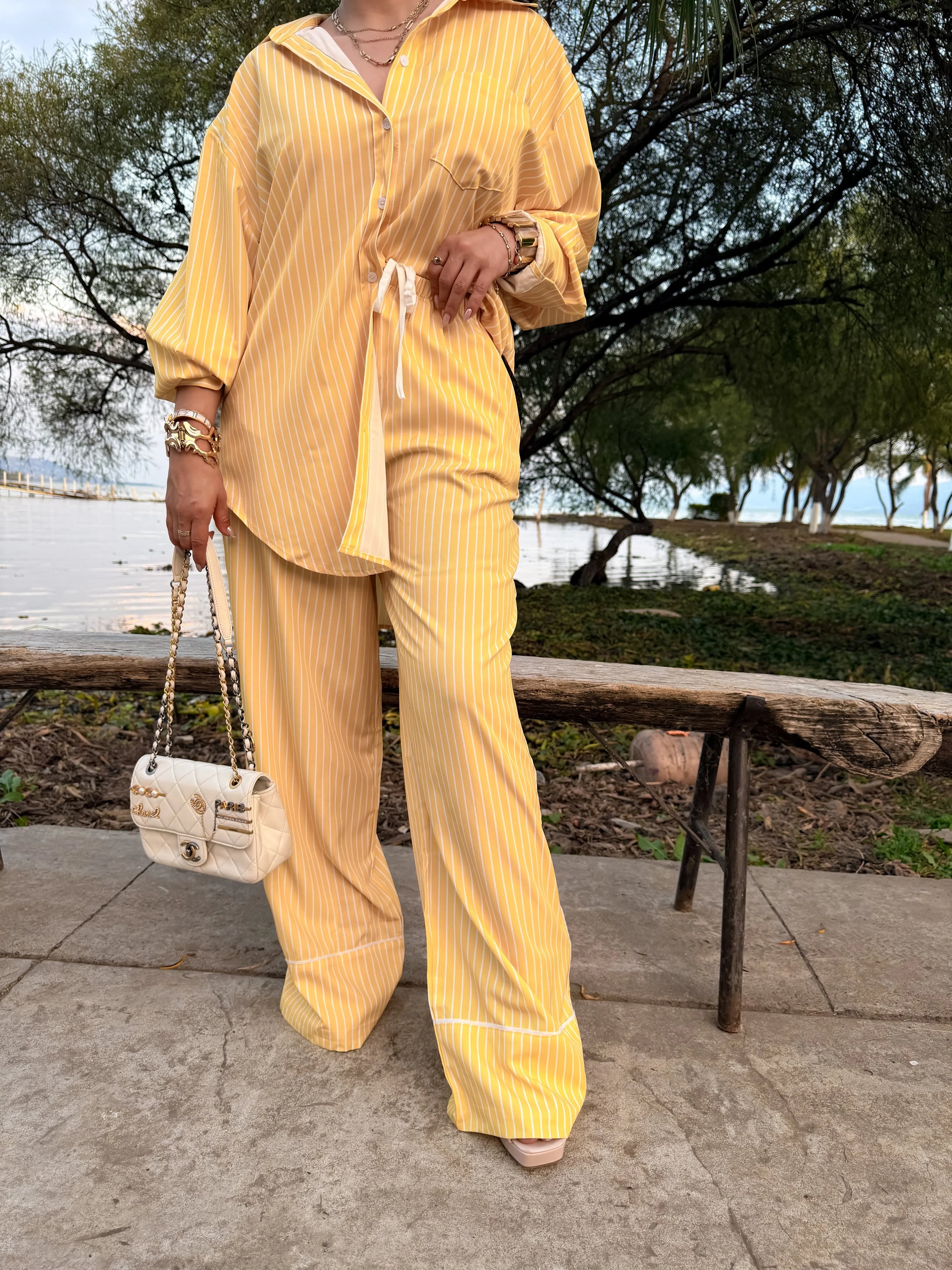 Un diseño que mezcla estructura y movimiento en perfecta armonía. Este set está confeccionado en un tejido ligero con transparencia sutil y delicadas rayas en diferentes direcciones que estilizan la silueta y aportan dinamismo visual.