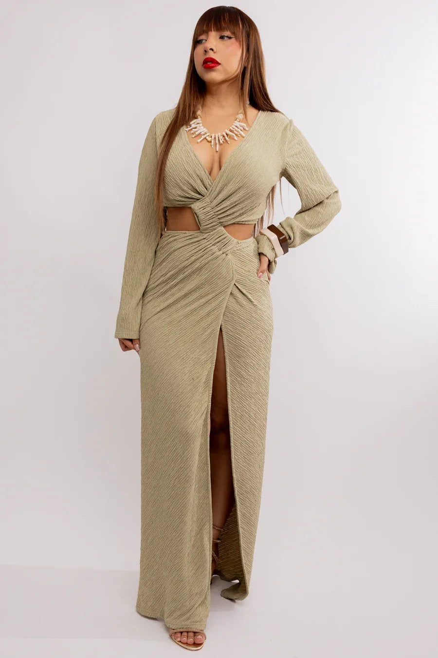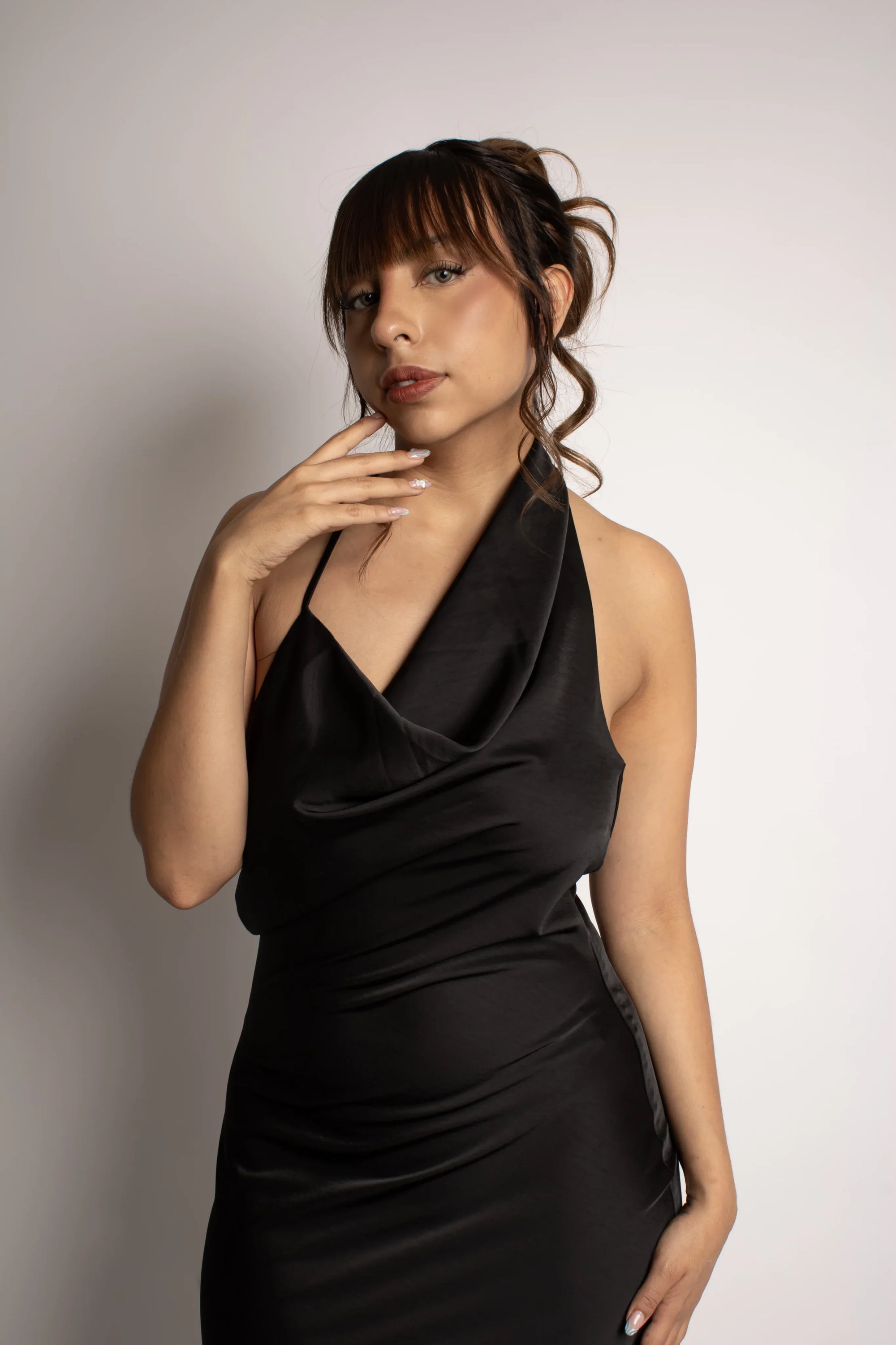 VESTIDO LARGO NEGRO CON DRAPEADO Y ESCOTE PROFUNDO